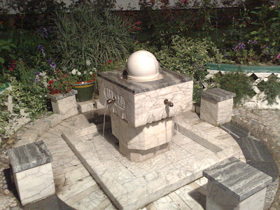 The sheikh was awarded the Golden Lilly, the highest military honor for his efforts during the defense of Bosnia. The General, the Sheikh, and the Luminary. His students find everything in one man. He salutes us as we leave his hand on his heart with a warm smile. It was an invitation to return. For Sheikh Hulusi the real struggle was about to begin. Spiritual heights to reach, political advice to give, a nation to pull together from the debris of the past. Water trickles from the beautiful white and grey marble fountain which is topped with a bright white sphere that turns with the water flow